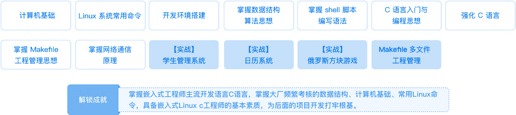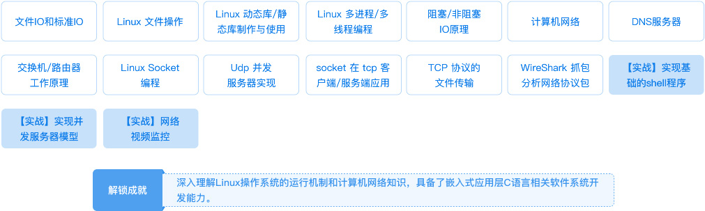 | 本阶段职业定位 | Linux C语言开发工程师、Linux后端开发工程师、Linux网络开发工程师、Linux应用开发工程师、游戏后端工程师 | ||