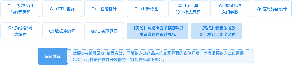 | 本阶段职业定位 | C++开发工程师、linux后端工程师、网游服务器开发、金融证券后端开发、Qt开发工程师、桌面应用开发 | ||