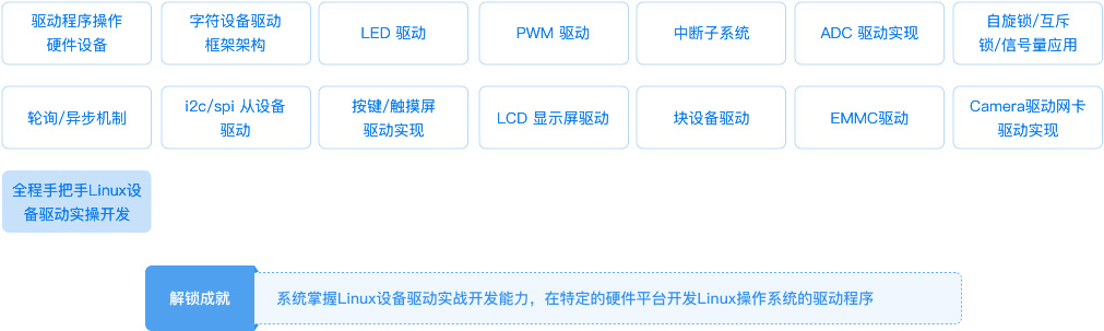 | Linux驱动开发 | Bootloader 设计与移植、Linux 内核开发移植、Linux 文件系统、Linux 设备驱动开发、工程实例驱动开发、块设备驱动、Framebuffer驱动 |