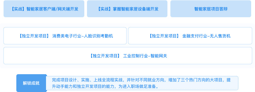 | 阶段性项目 | 《智能家居控制系统》、《智能公交站牌》、《温湿度大棚智能控制系统》、《无人售货机》、《小区智能门禁系统》、《智慧教室终端》、《环保数采仪》 | ||