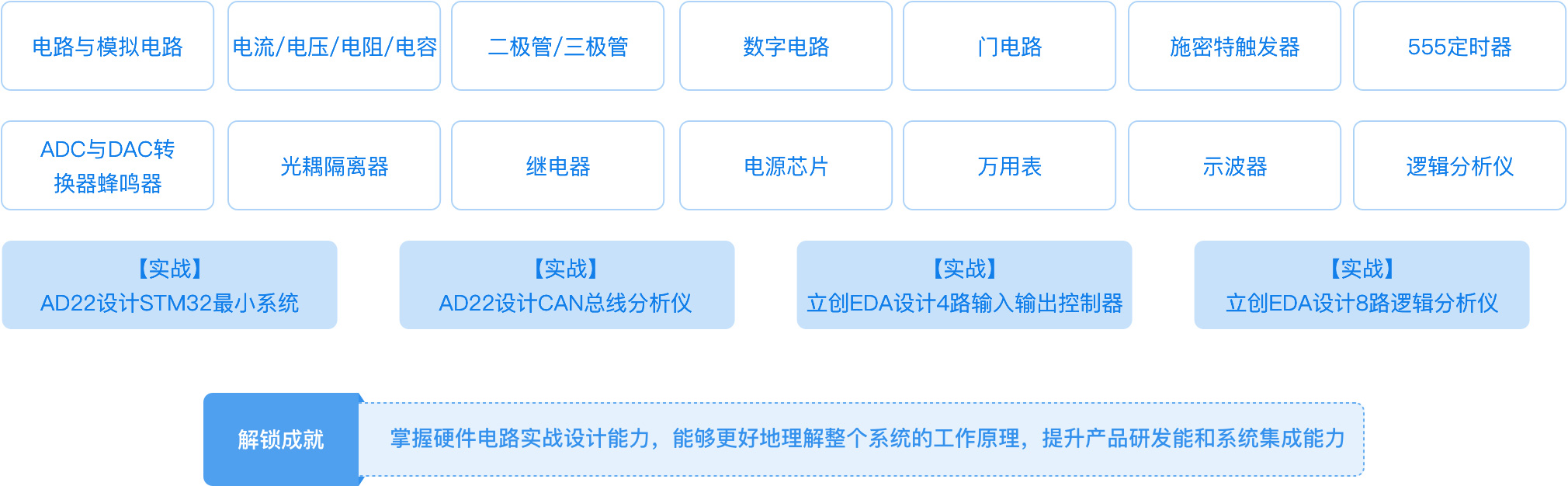 | STM32应用程序开发 | 硬件基础 | 数电、模电基础、常用元器件、常见电路分析、万用表、示波器的使用 | 3周 |